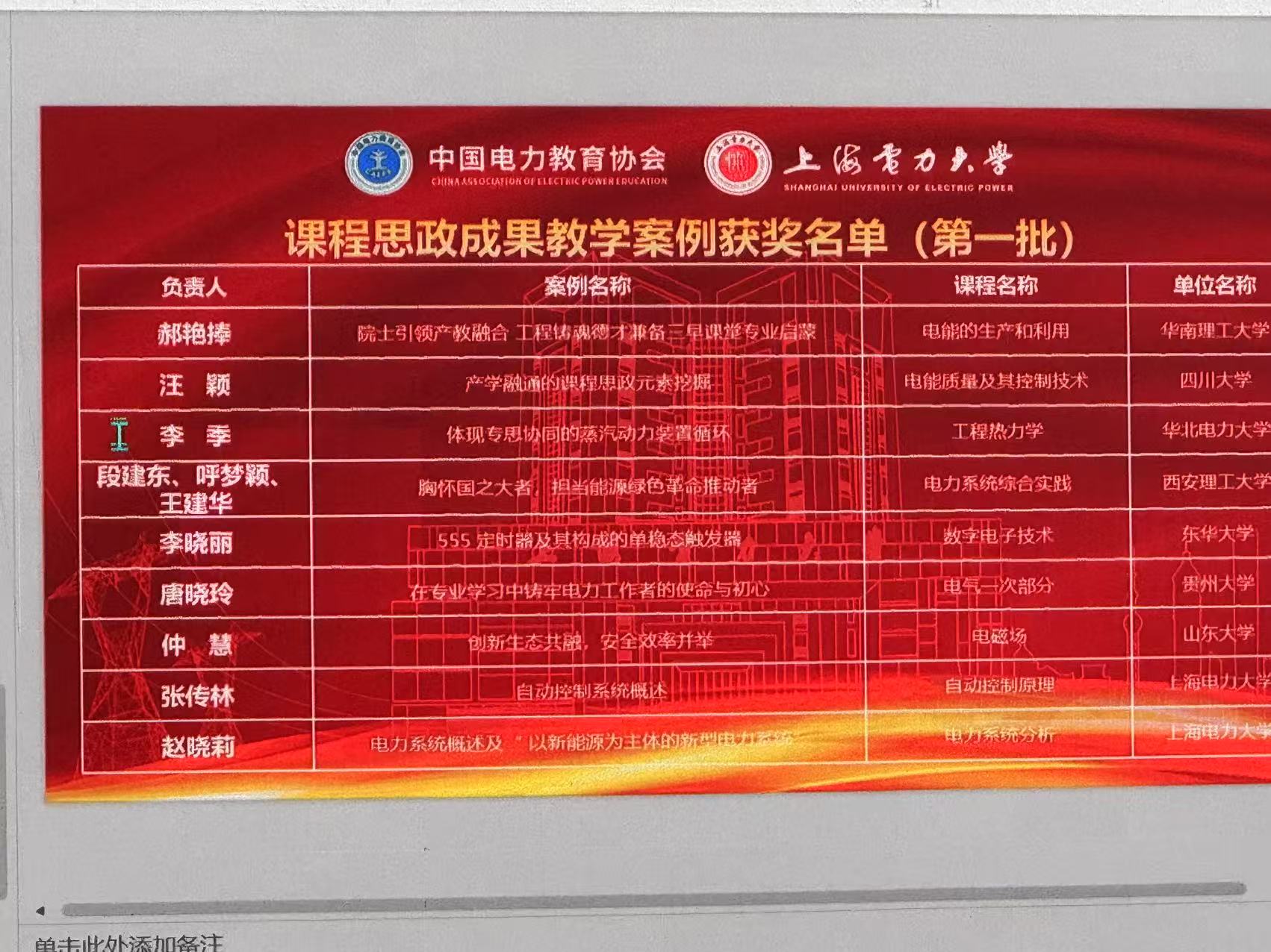 4月20日,中國電力教育協會課程思政建設工作委員會成立大會暨2024年度電力行業高等院校課程思政建設成果教學案例交流會在上海電力大學召開。學院唐曉玲老師《電氣一次部分》課程“在專業學習中鑄牢電力工作者的使命與初心”獲評優秀案例,成為15個課程思政成果教學案例之一。