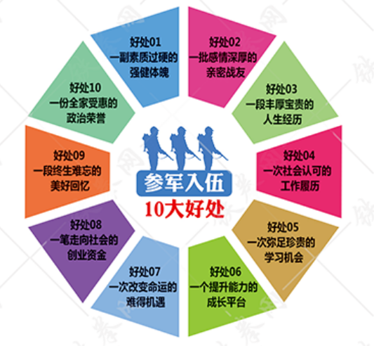 3522集團(tuán)新網(wǎng)站應(yīng)征入伍宣傳提綱 (2021版) 一、入伍重要知識(shí)點(diǎn) 征兵時(shí)間 從2021年開(kāi)始,征兵時(shí)間區(qū)分為上半年和下半年兩次,上半年征兵從2月中旬開(kāi)始,3月底結(jié)束,新兵批準(zhǔn)入伍時(shí)間為3月1日;下半年征兵從8月中旬開(kāi)始,9月底結(jié)束,新兵批準(zhǔn)入伍時(shí)間為9月1日;征集對(duì)象以大學(xué)生為重點(diǎn)。上半年征兵重點(diǎn)征集各級(jí)各類(lèi)院校往屆畢業(yè)生、高職高專(zhuān)畢業(yè)班學(xué)生和各類(lèi)社會(huì)技能人才,下半年征兵重點(diǎn)征集各級(jí)各類(lèi)院校應(yīng)屆畢業(yè)生、在校生和新生。著眼為優(yōu)秀青年應(yīng)征入伍提供均等機(jī)會(huì)。 春季征兵有哪些政策優(yōu)惠和優(yōu)勢(shì)? 春季參軍入伍有諸多政策優(yōu)惠和優(yōu)勢(shì): @提前拿畢業(yè)證。教育部、中央軍委國(guó)防動(dòng)員部聯(lián)合下發(fā)通知明確: “上半年批準(zhǔn)入伍的高校畢業(yè)生, 在完成課程學(xué)習(xí)、畢業(yè)設(shè)計(jì)和論文答辯合格, 符合畢業(yè)條件的準(zhǔn)予畢業(yè)。” 且上半年入伍免畢業(yè)設(shè)計(jì)和畢業(yè)答辯。上半年春季入伍的小伙伴們?nèi)绻蠗l件, 到部隊(duì)后就可以領(lǐng)取畢業(yè)證。 @入伍第二年快速考軍校。報(bào)考軍校兵齡要求: “ 義務(wù)兵考生必須服現(xiàn)役滿1年, 士官考生必須服現(xiàn)役滿2年、不超過(guò)3年” 。每年部隊(duì)考軍校與地方高考時(shí)間相同, 都是六月份, 如果春季三月份入伍, 到第二年六月份就滿足條件。而夏秋季入伍是九月份入伍, 要到第三年六月份才能滿足條件。 服役時(shí)間 義務(wù)兵(即應(yīng)征入伍)服現(xiàn)役的期限為二年,士兵退役時(shí)間對(duì)應(yīng)其批準(zhǔn)服現(xiàn)役時(shí)間。士官視自己意愿和部分需求確定。 入伍年齡 年齡不是要過(guò)了生日, 而是當(dāng)年滿18周歲就可以, 與年初年尾出生無(wú)關(guān)。在校生18-22歲。畢業(yè)生18-24歲。例如:2021年征兵年齡為在校生出生年齡介于1999.1.1-2003.12.31;畢業(yè)生出生年齡介于1997.1.1-2003.12.31。 入伍基本條件 男:身高:160CM以上;空腹血糖<7.0mmol/L且17.5≦BMI<30(BMI=體重(kg)/身高(m)的平方),其中17.5≦男性身體條件兵BMI<27;左右眼視力不低于4.5。 其它可以參看相關(guān)體檢標(biāo)準(zhǔn)。 義務(wù)兵、士官、軍官 義務(wù)兵:義務(wù)兵; 士官:軍士 士官與義務(wù)兵(應(yīng)征入伍)兼報(bào)。 下半年報(bào)名入伍的,還可以兼報(bào)應(yīng)征入伍和考士官。士官需要查詢當(dāng)年國(guó)家招收士官專(zhuān)業(yè)目錄。如果士官?zèng)]走成,仍可以走應(yīng)征入伍通道,先入伍,再在部隊(duì)轉(zhuǎn)士官、提干、考軍校. 入伍后發(fā)展空間 1.報(bào)考軍校:通過(guò)干部選拔考試并入軍校學(xué)習(xí)成為軍官。義務(wù)兵服役滿1年,士官服役滿2年(不超過(guò)3年)可報(bào)考軍校(雙一流大學(xué)學(xué)生免試入學(xué))。 2.保送入學(xué):大學(xué)畢業(yè)生可參加優(yōu)秀士兵保送入學(xué)對(duì)象選拔(年齡不超過(guò)26歲),同等條件優(yōu)先列為推薦對(duì)象。符合有關(guān)條件,可以保送入軍隊(duì)院校參加6個(gè)任職培訓(xùn)。 3.選取士官:對(duì)符合士官選取條件的士兵,同等條件下優(yōu)先選取。選取為士官確定軍銜等級(jí)和工資起點(diǎn)標(biāo)準(zhǔn)時(shí),大學(xué)在校就讀年限視為服役時(shí)間。 4.士兵提干:本科生取得畢業(yè)證、學(xué)位證學(xué)生入伍1.5年以上,或考研獲得學(xué)歷的,本科生年齡不超過(guò)26歲,研究生年齡不超過(guò)29歲,優(yōu)先列為提干對(duì)象。 5.培養(yǎng)使用:優(yōu)先安排參加專(zhuān)業(yè)技術(shù)培訓(xùn),可競(jìng)選擔(dān)任班長(zhǎng)骨干,具有全日制大專(zhuān)以上學(xué)歷的士兵可以免試進(jìn)入軍士學(xué)校學(xué)習(xí)一年。 軍士軍銜三等七銜 高級(jí)軍士:一級(jí)軍士長(zhǎng)、二級(jí)軍士長(zhǎng)、三級(jí)軍士長(zhǎng) 中級(jí)軍士:一級(jí)上士、二級(jí)上士 初級(jí)軍士:中士、下士 退役后的就業(yè)發(fā)展: 退役后,根據(jù)個(gè)人不同條件,可以有政府安排工作、就業(yè)創(chuàng)業(yè)、報(bào)考公務(wù)員事業(yè)單位(很多地方有優(yōu)撫或加分政策)。(優(yōu)勢(shì):服役兩年期間部隊(duì)按國(guó)家規(guī)定繳納社保,退役后算作兩年工齡,可報(bào)考相關(guān)需要兩年工作經(jīng)驗(yàn)的崗位,同崗位條件下優(yōu)先考慮退伍軍人) 復(fù)學(xué)、升學(xué) 1.退役后復(fù)學(xué)的學(xué)生,參加全國(guó)統(tǒng)一考試報(bào)考我校碩士研究生的,在實(shí)行國(guó)家關(guān)于普通高校應(yīng)屆畢業(yè)生退役后按規(guī)定享受加分政策(完成本科學(xué)業(yè)后3年內(nèi)參加全國(guó)碩士研究生招生考試,初試總分加10分)的基礎(chǔ)上,同等條件下優(yōu)先錄取。 2.學(xué)校在研究生招生計(jì)劃中單列退役大學(xué)生士兵專(zhuān)項(xiàng)碩士研究生招生計(jì)劃,專(zhuān)門(mén)面向退役大學(xué)生士兵招生,競(jìng)爭(zhēng)小、空間大。 3.學(xué)校支持學(xué)院錄取我校應(yīng)征入伍的本科畢業(yè)生攻讀碩士研究生,對(duì)錄取學(xué)生保留研究生入學(xué)資格至退役后2年。 政